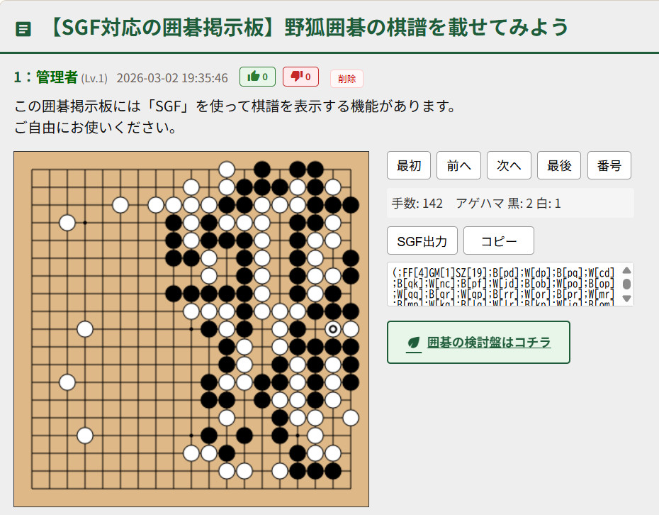 この記事では「野狐囲碁の棋譜」を「SGF」を使って「掲示板に載せる方法」をご紹介いたします。普通の掲示板は無理です。あくまで、私が運営している「自治掲示板」の囲碁掲示板の方のみの話なので、その点、よろしくどうぞです。